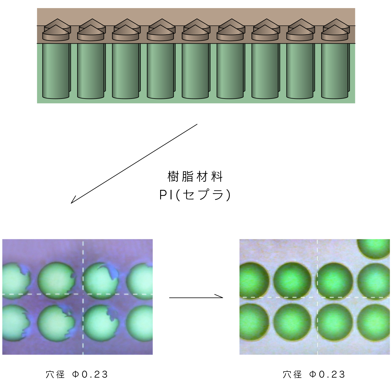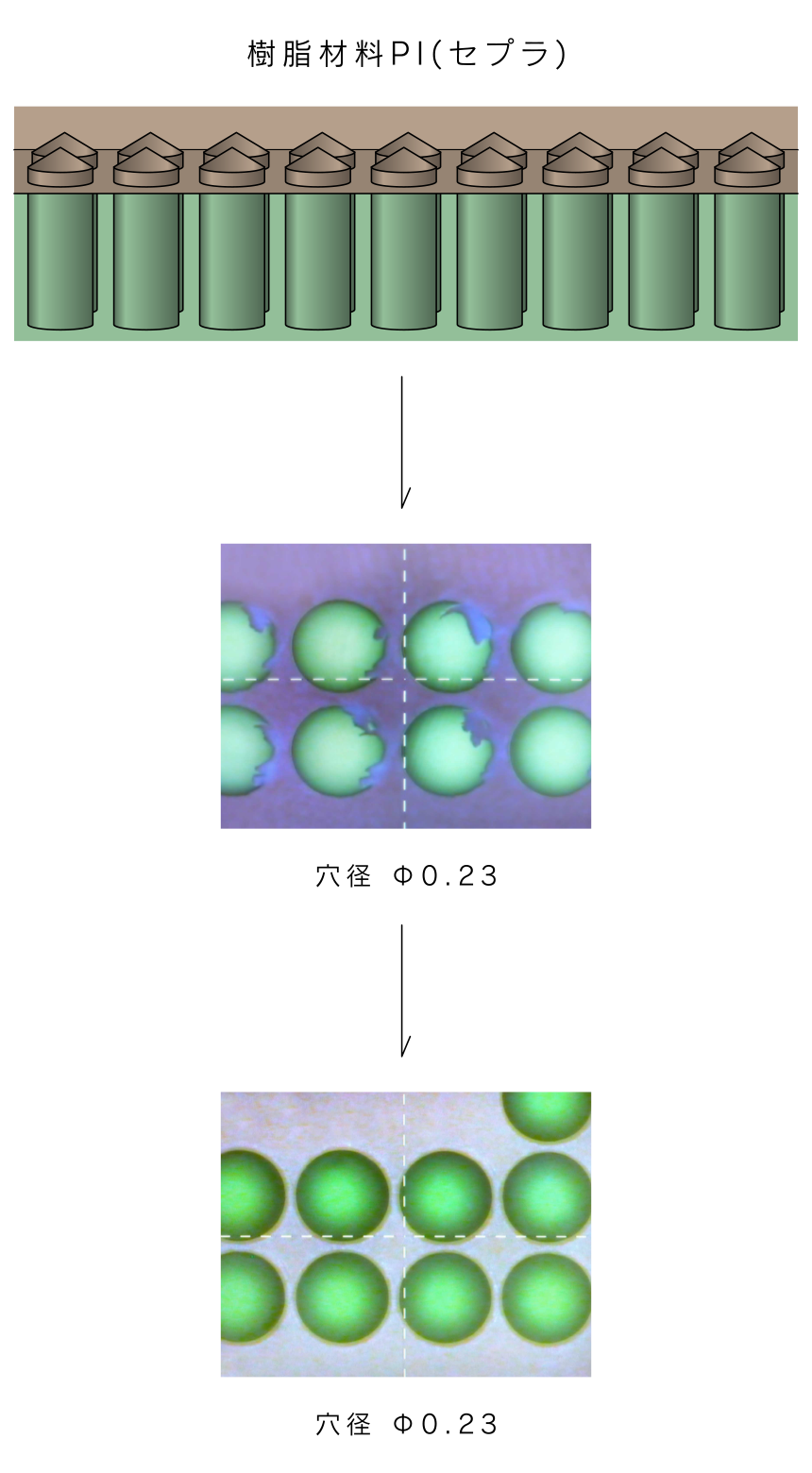 ドリル加工(Φ0.23)後に上面部分(茶色)を